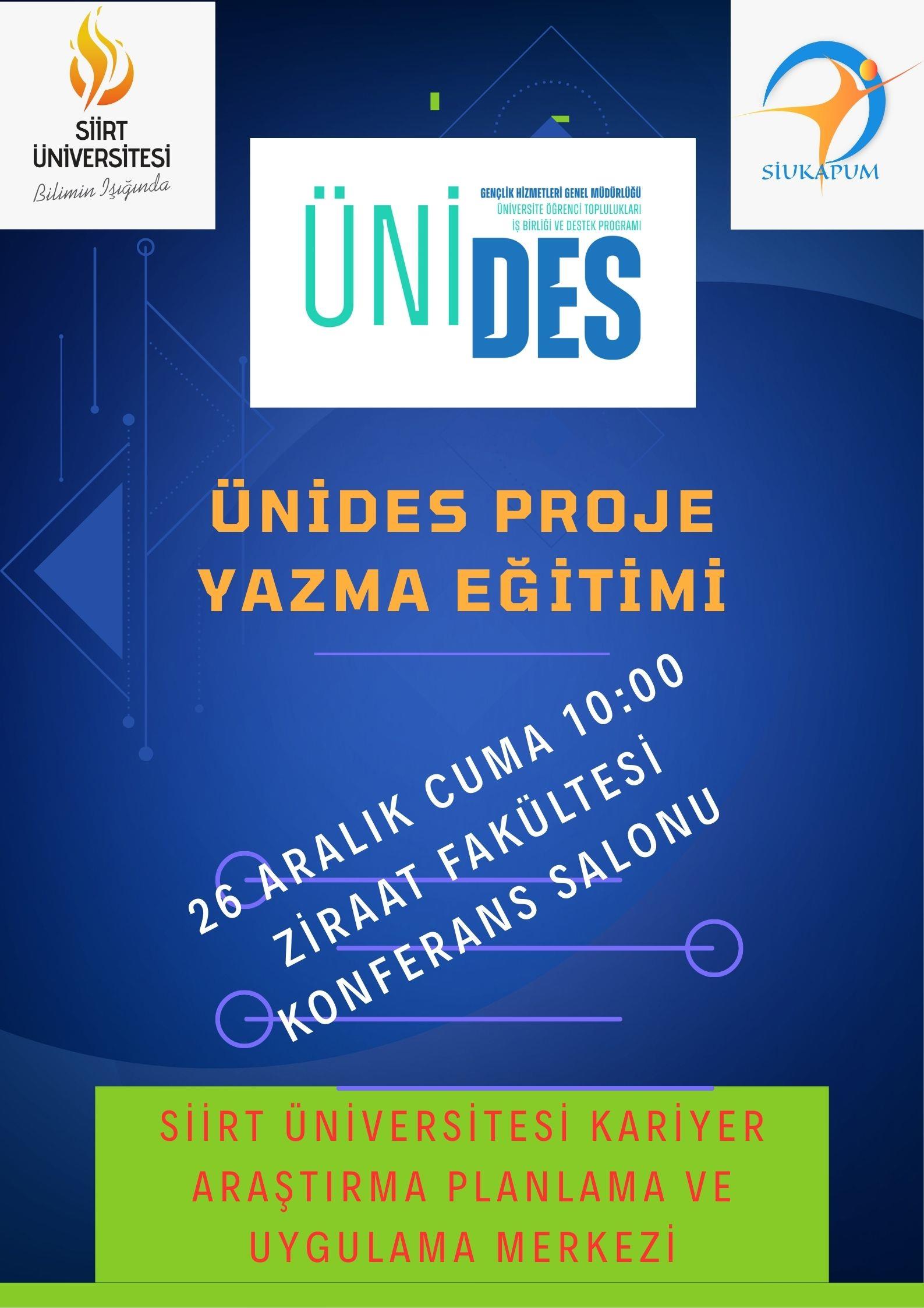 Siirt Üniversitesi Kariyer Planlama Uygulama ve Araştırma Merkezi (KAPUM) tarafından, Gençlik ve Spor Bakanlığı Gençlik Hizmetleri Genel Müdürlüğü iş birliğiyle “ÜNİDES Projesi Nasıl Yazılır?” başlıklı bilgilendirme eğitimi gerçekleştirilecektir. Söz konusu eğitimde Üniversite Öğrenci Toplulukları İş Birliği ve Destek Programı (ÜNİDES) kapsamında proje hazırlama süreçleri, başvuru adımları ve proje yazım teknikleri kapsamlı şekilde ele alınacaktır.