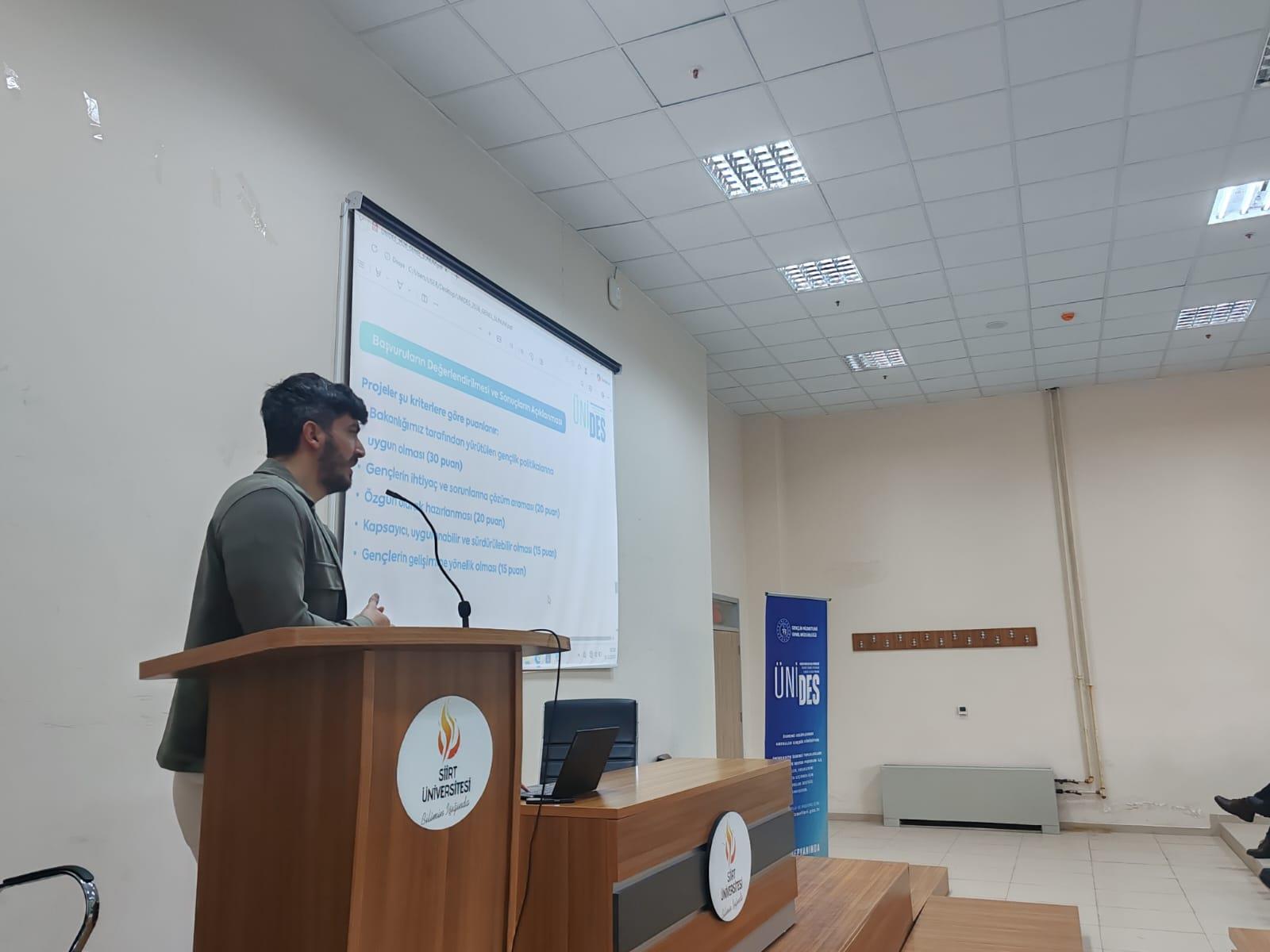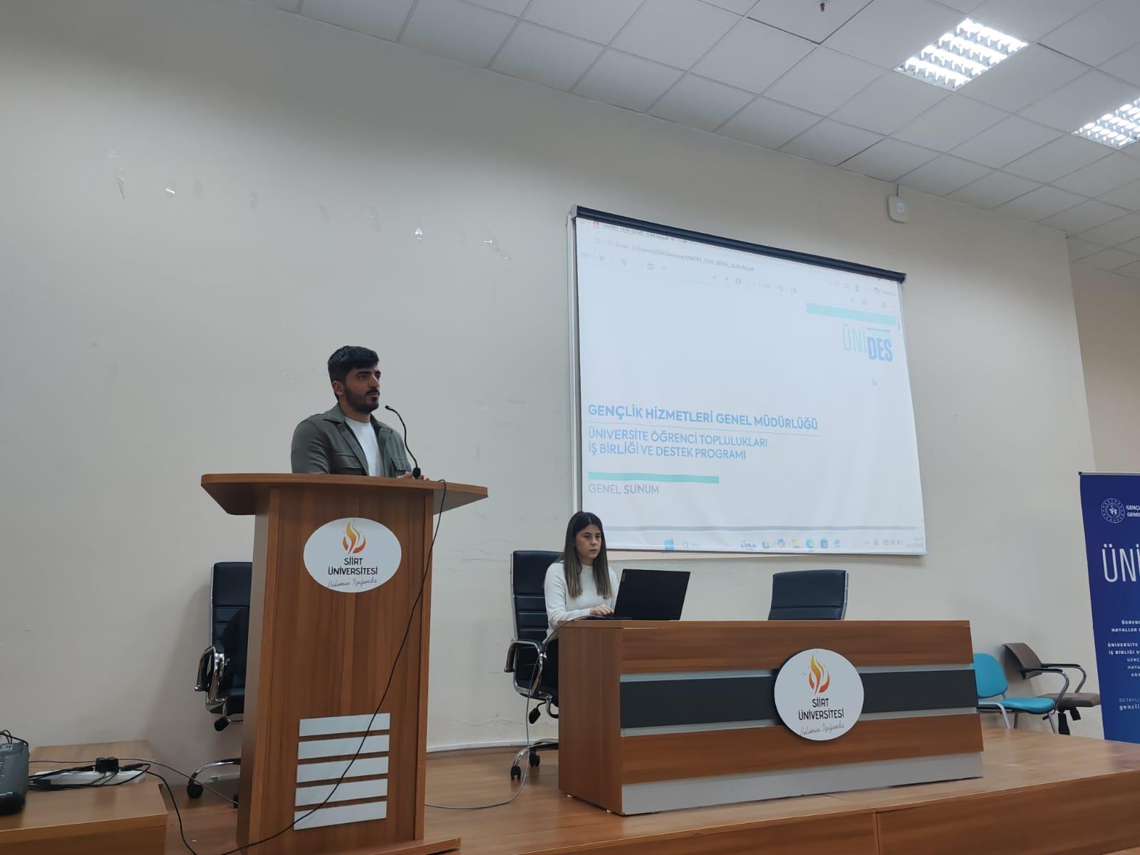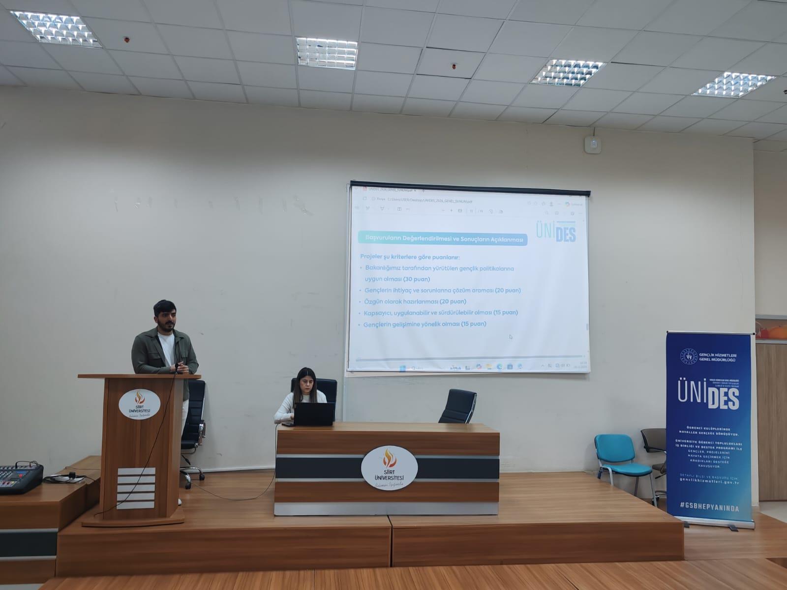 Siirt Üniversitesi Kariyer Planlama Uygulama ve Araştırma Merkezi (KAPUM) tarafından, Gençlik ve Spor Bakanlığı Gençlik Hizmetleri Genel Müdürlüğü iş birliğiyle “ÜNİDES Projesi Nasıl Yazılır?” başlıklı bilgilendirme eğitimi gerçekleştirilmiştir. Söz konusu eğitimde Üniversite Öğrenci Toplulukları İş Birliği ve Destek Programı (ÜNİDES) kapsamında proje hazırlama süreçleri, başvuru adımları ve proje yazım teknikleri kapsamlı şekilde ele alınmıştır.